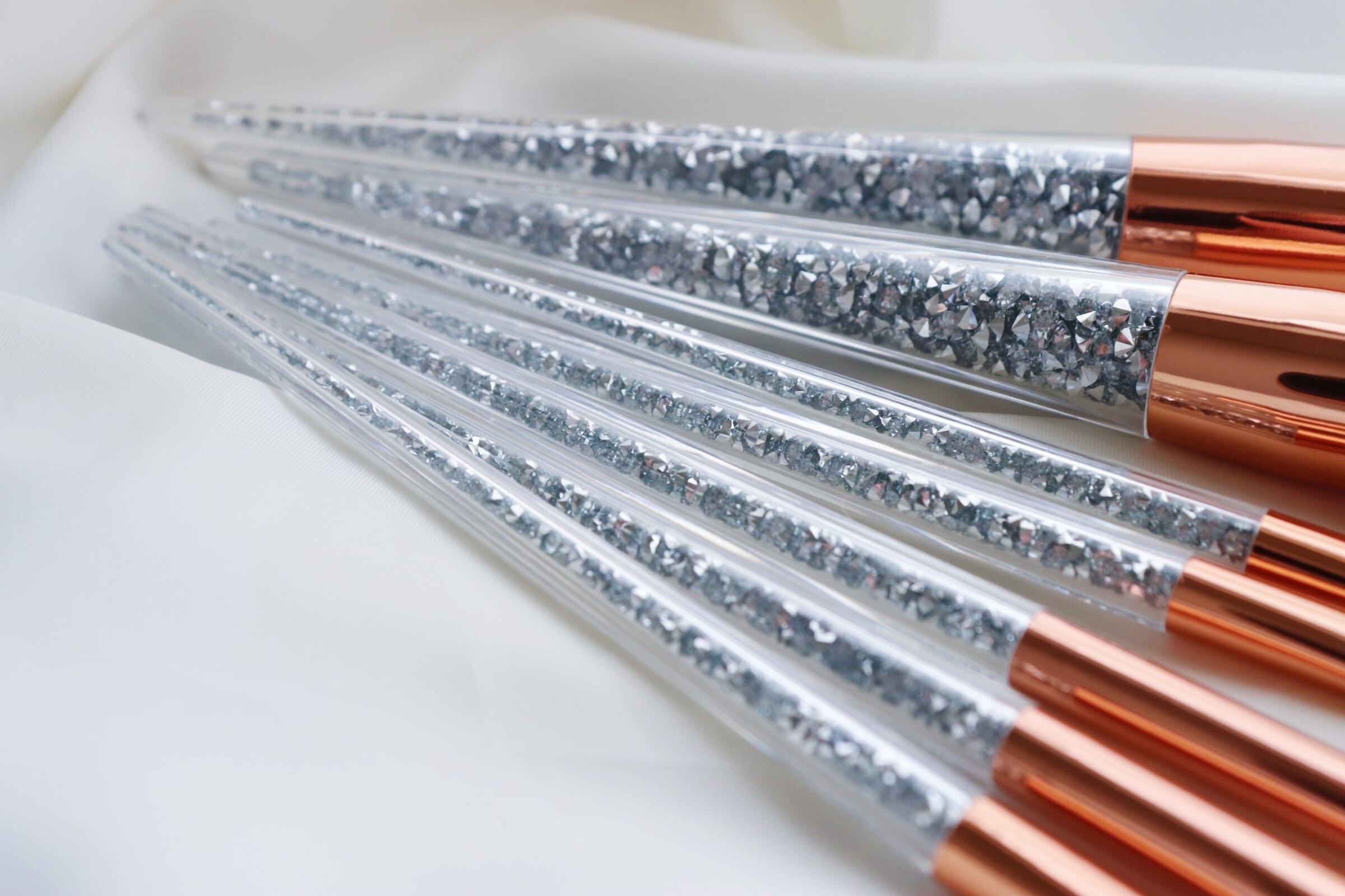 キラキラのグリッターが持ち手に贅沢に入っているメイクアップブラシセットになります。置いてるだけでキラキラするブラシはインテリアとしても優秀。