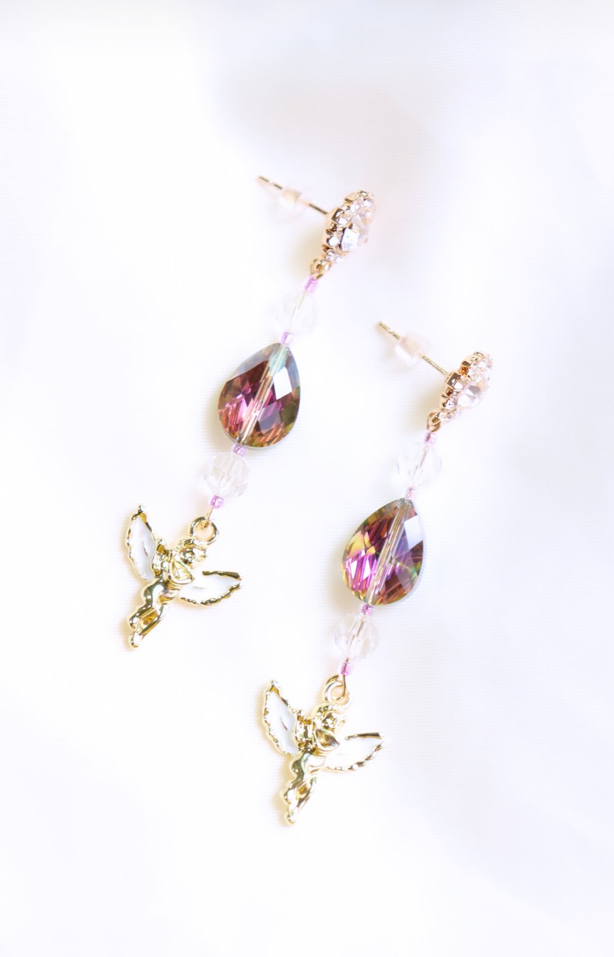 パールビーズやパール系のクリスタルビーズをつかったビーズ。天使のチャームが可愛さを倍増させてくれる個性派アクセサリーになります。他のアクセサリーより大振りにも見えますが華奢なラインなのでファッションの邪魔もしないもの。